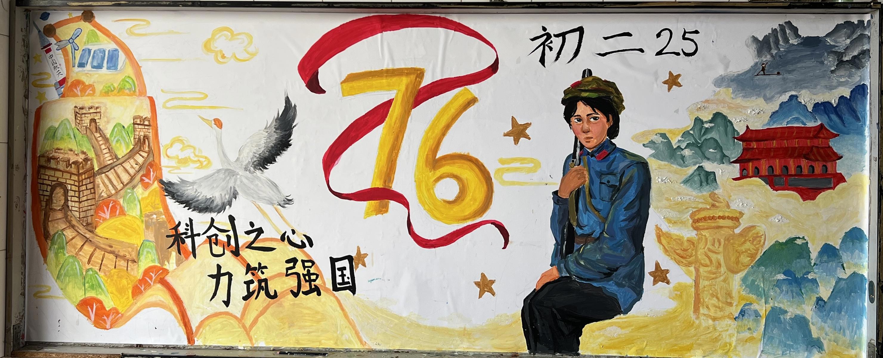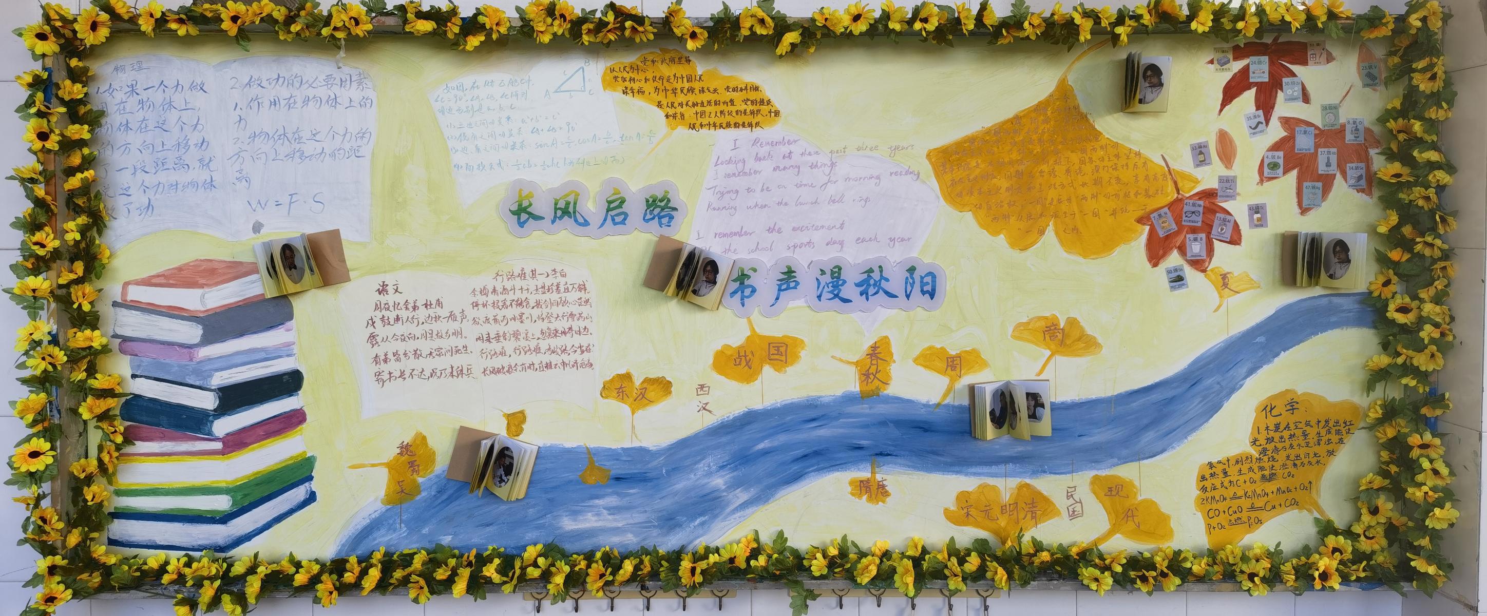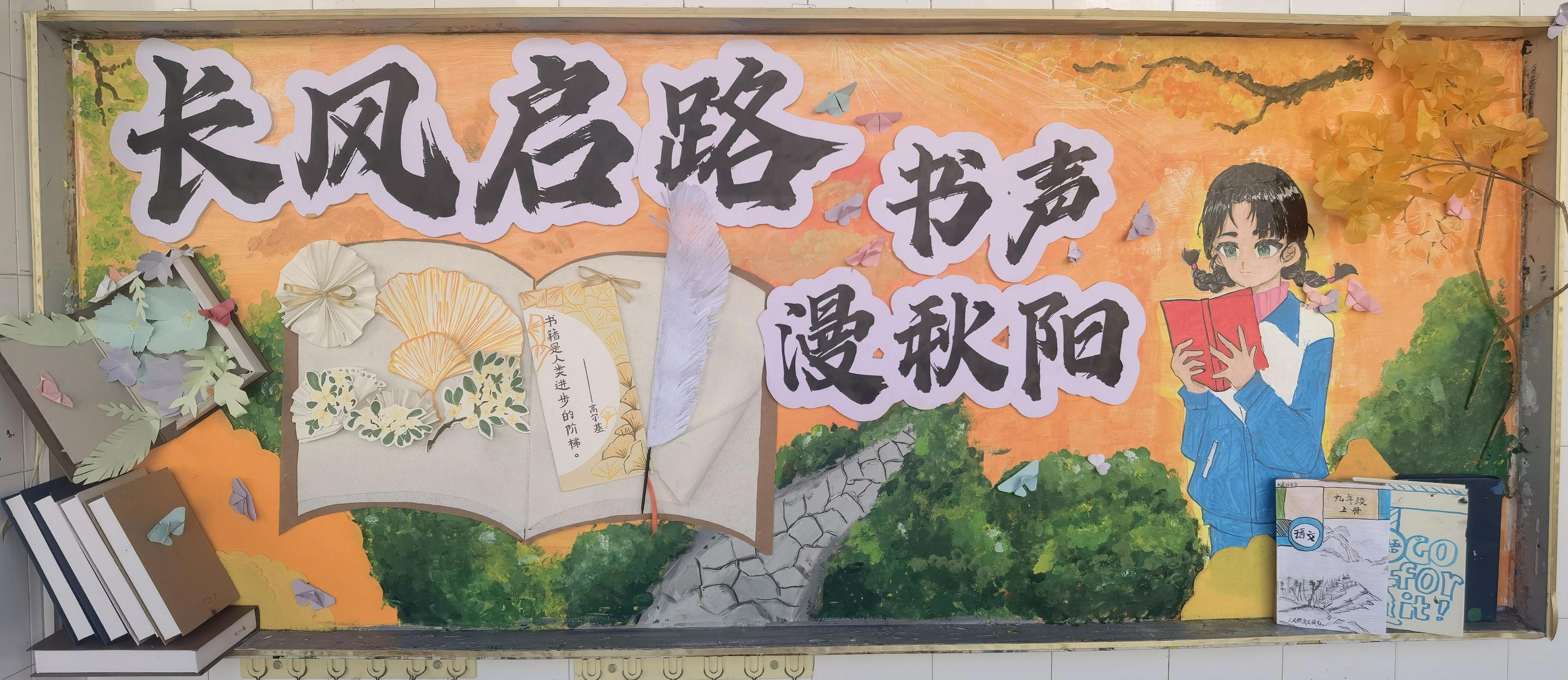 面对即将到来的挑战,初三年级同学的黑板报主题更显沉稳与坚定——“贺祖国繁荣昌盛,立少年强国初心”。大气的版面布局与真挚的文字,抒发出他们对祖国的热爱与肩负时代责任的决心。他们的橱窗则以“长风启路,书声漫秋阳”为主题,营造出浓郁而宁静的书香氛围。秋风与阳光中,仿佛能听见琅琅书声,感受到学子们以梦为马、不负韶华的奋进姿态。