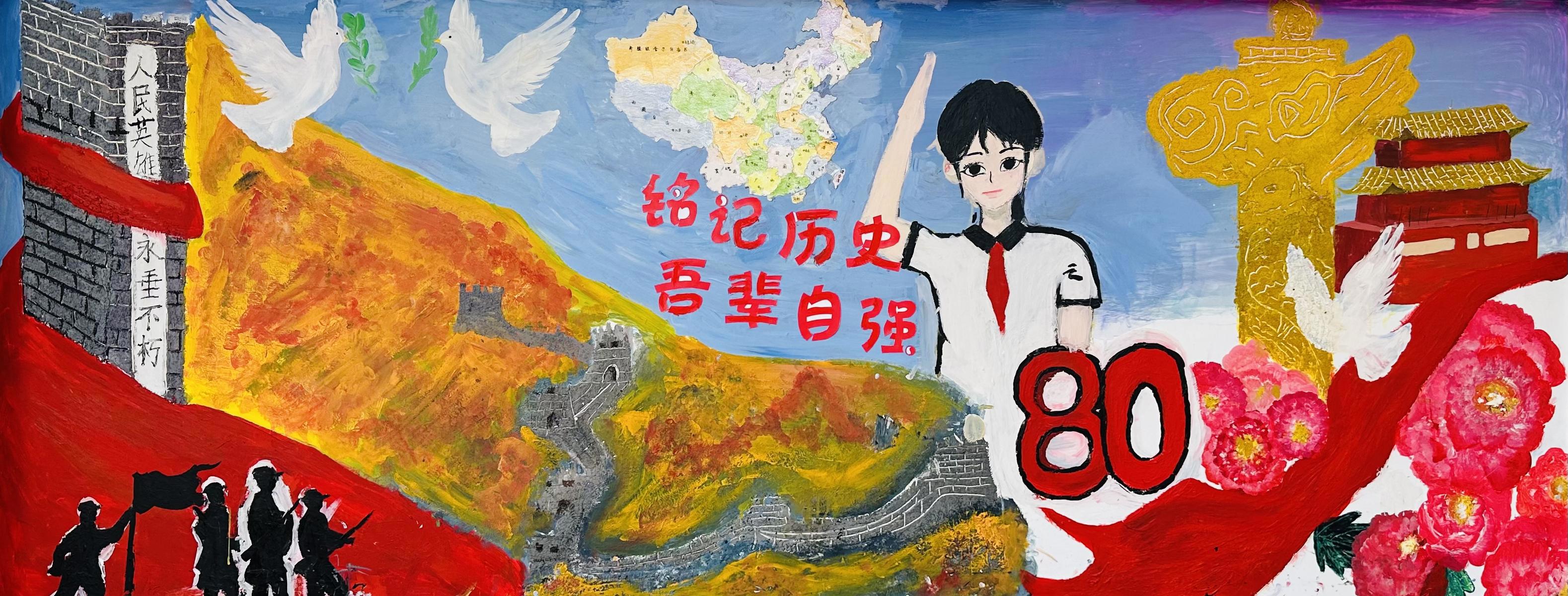 对于刚刚踏入中学校园的初一年级同学而言,“云附我来了”是学子对新生活的热情宣言。色彩斑斓的图案旁,“你好,云附!读好书、交好友、行远路、做大事”等文字洋溢着青春的朝气与对未来的规划。与此同时,他们的橱窗创作则聚焦于“纪念伟大抗战胜利、弘扬伟大抗战精神、实现中华民族伟大复兴”这一厚重主题。画面中,抗战英雄的剪影与现代化都市景象交织,“人民必胜、和平必胜”的宣言遒劲有力。艺术创作的过程,成为了一堂生动的历史课与爱国主义教育课,让同学们在描摹中铭记,在创作中感悟。