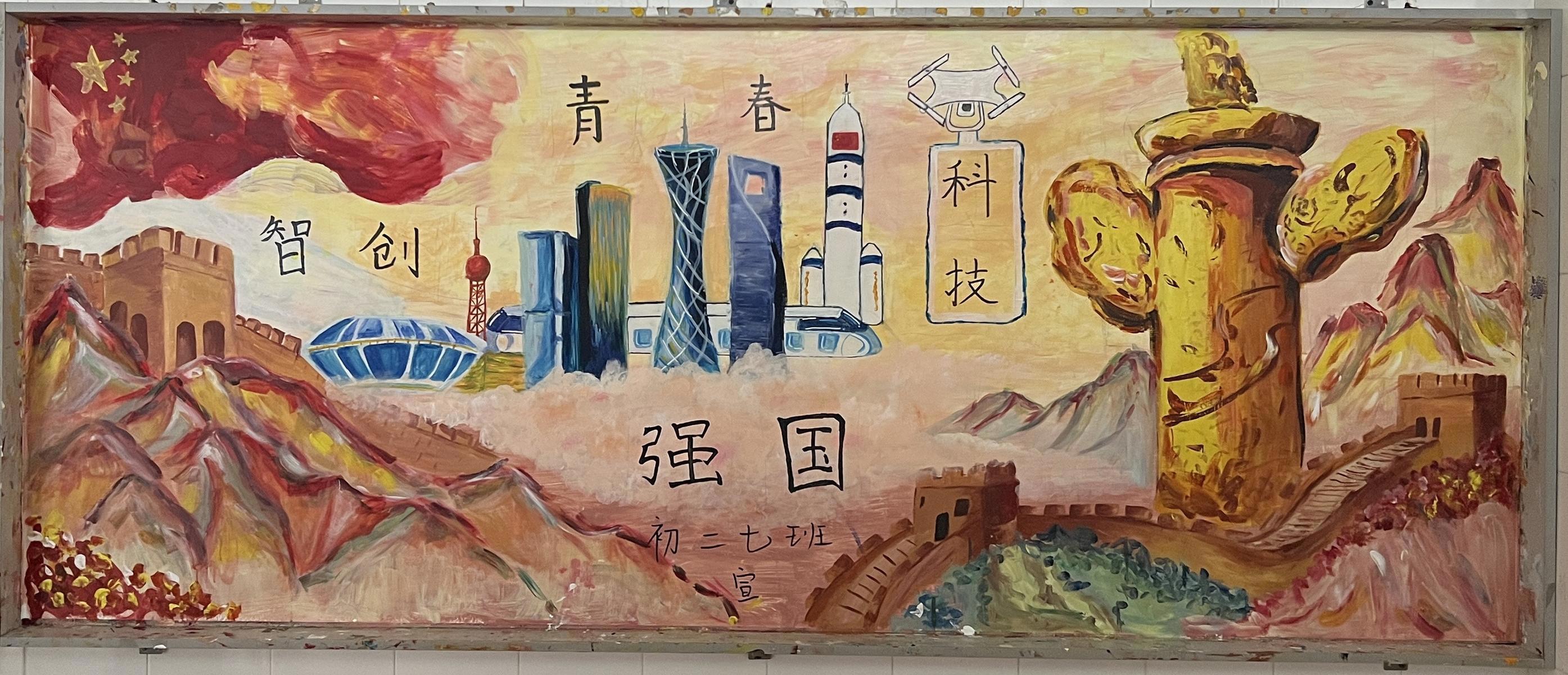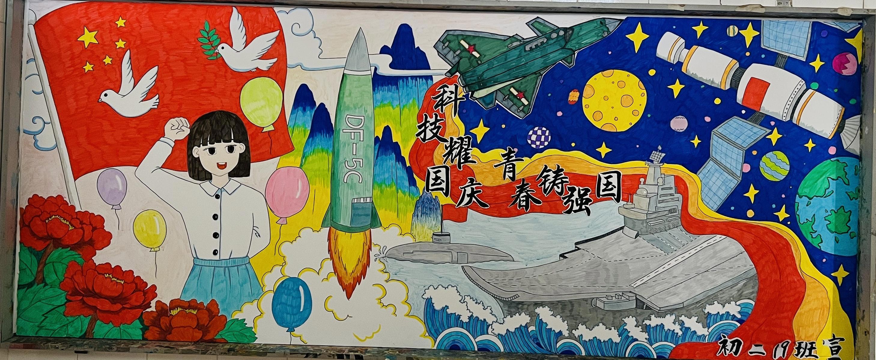 初二年级的黑板报,主题锁定“民族团结凝力量,青春同心向未来”。同学们通过丰富的民族图案和深刻的理解文字,诠释着“像石榴籽一样紧紧抱在一起”的团结精神。而在橱窗展示区,“科创之光耀国庆,青春之力铸强国”则成为主旋律。充满未来感的科创元素与炽热的爱国情怀在这里碰撞融合,展现了学子们对科技强国战略的深刻理解,以及用青春力量铸造强国之梦的担当。